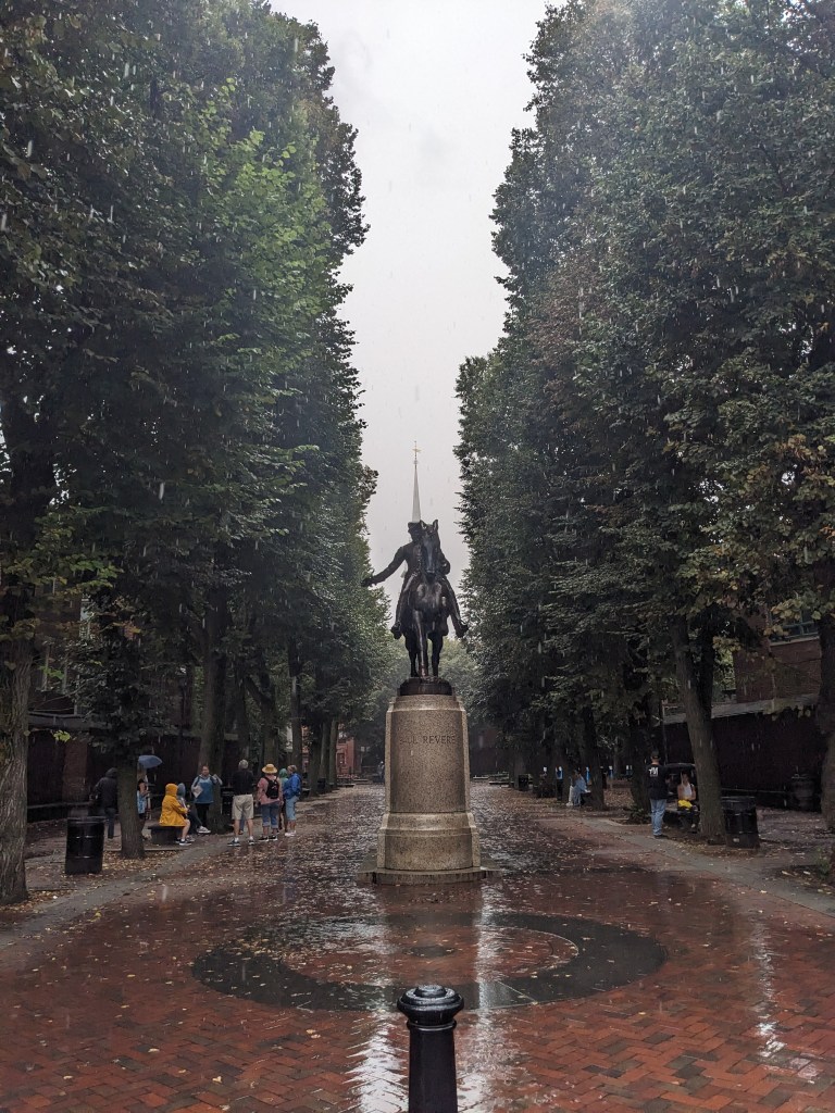 Aaaand rain it did – as you can see here, drenching both Mr. Revere and his horse. And that spire you see behind him?